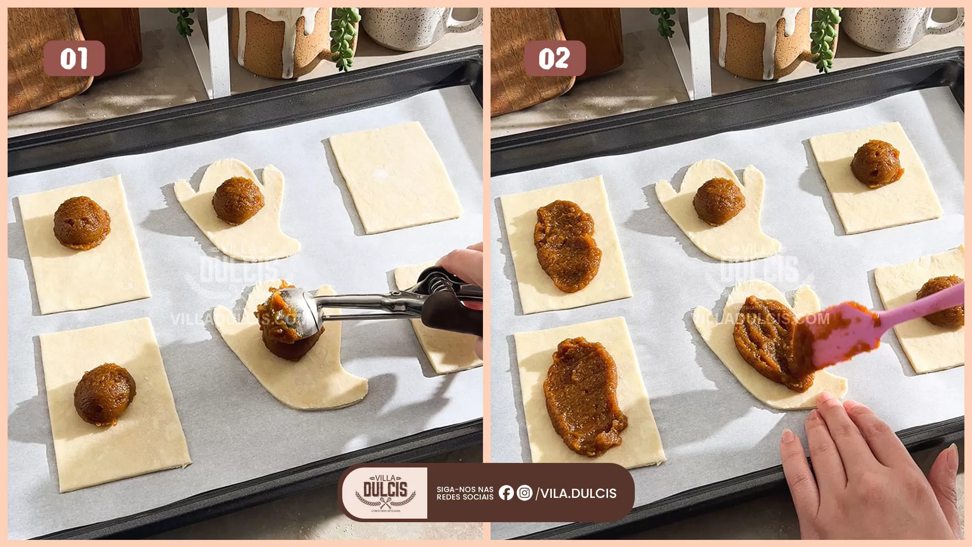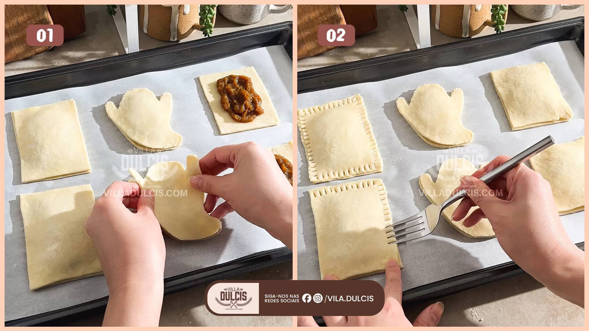 Transfira para a assadeira – Coloque um pedaço de recorte de massa de cada par na assadeira forrada, deixando cerca de 1-2 “de espaço entre cada um.