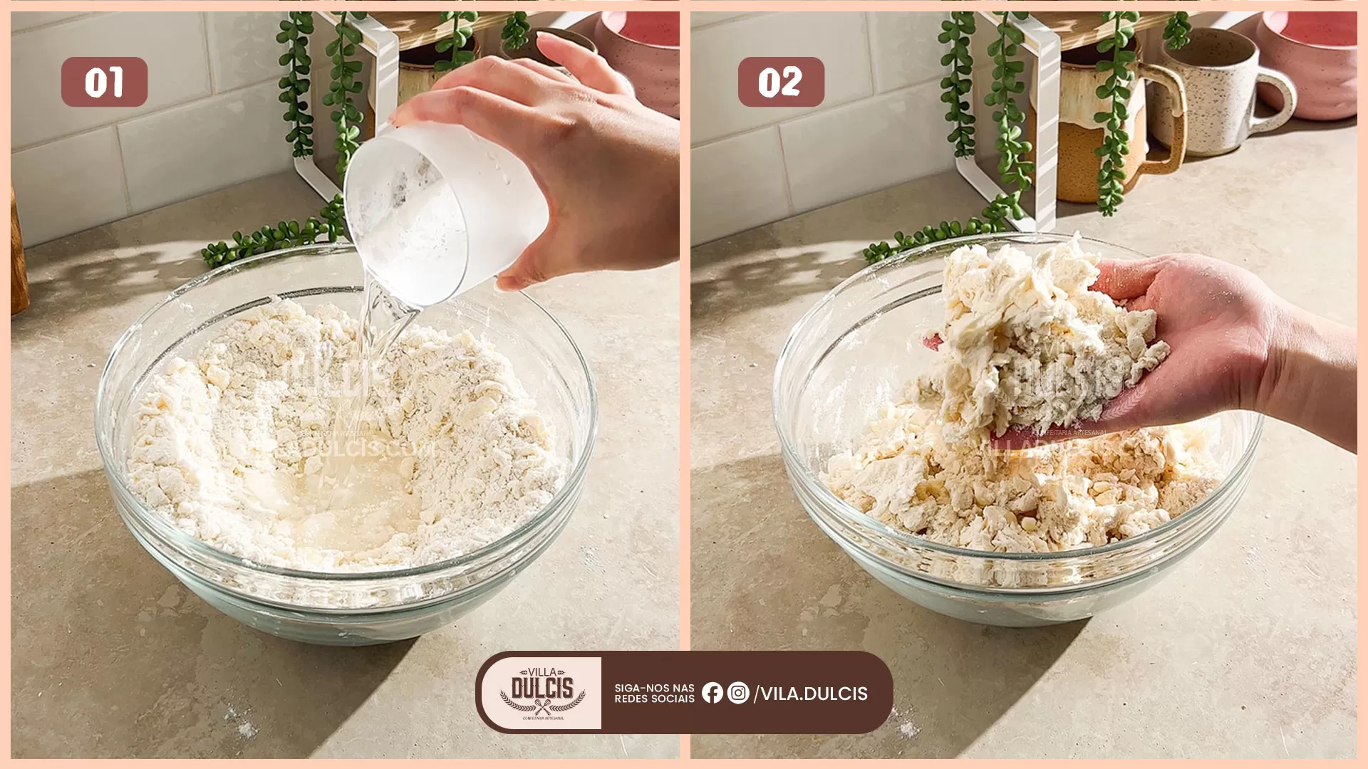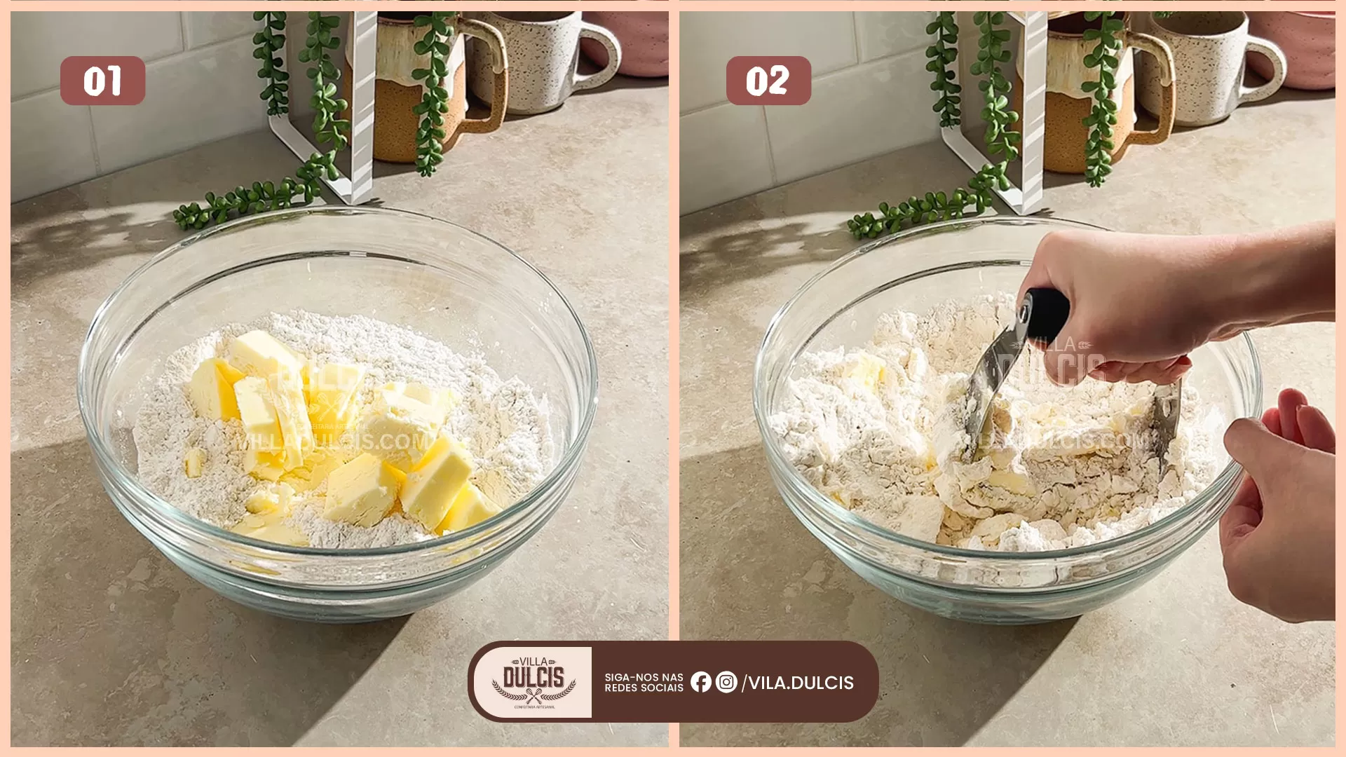 Corte a manteiga na farinha – Em uma tigela grande, misture a farinha e o sal. Adicione os cubos de manteiga fria e misture bem com a farinha. Use um cortador de massa ou as mãos para pressionar a manteiga em pedaços do tamanho de ervilhas.