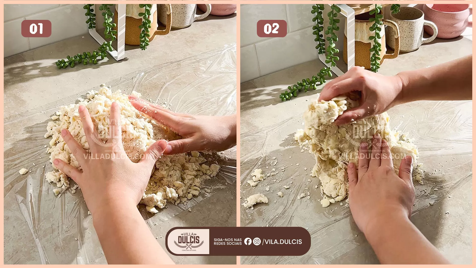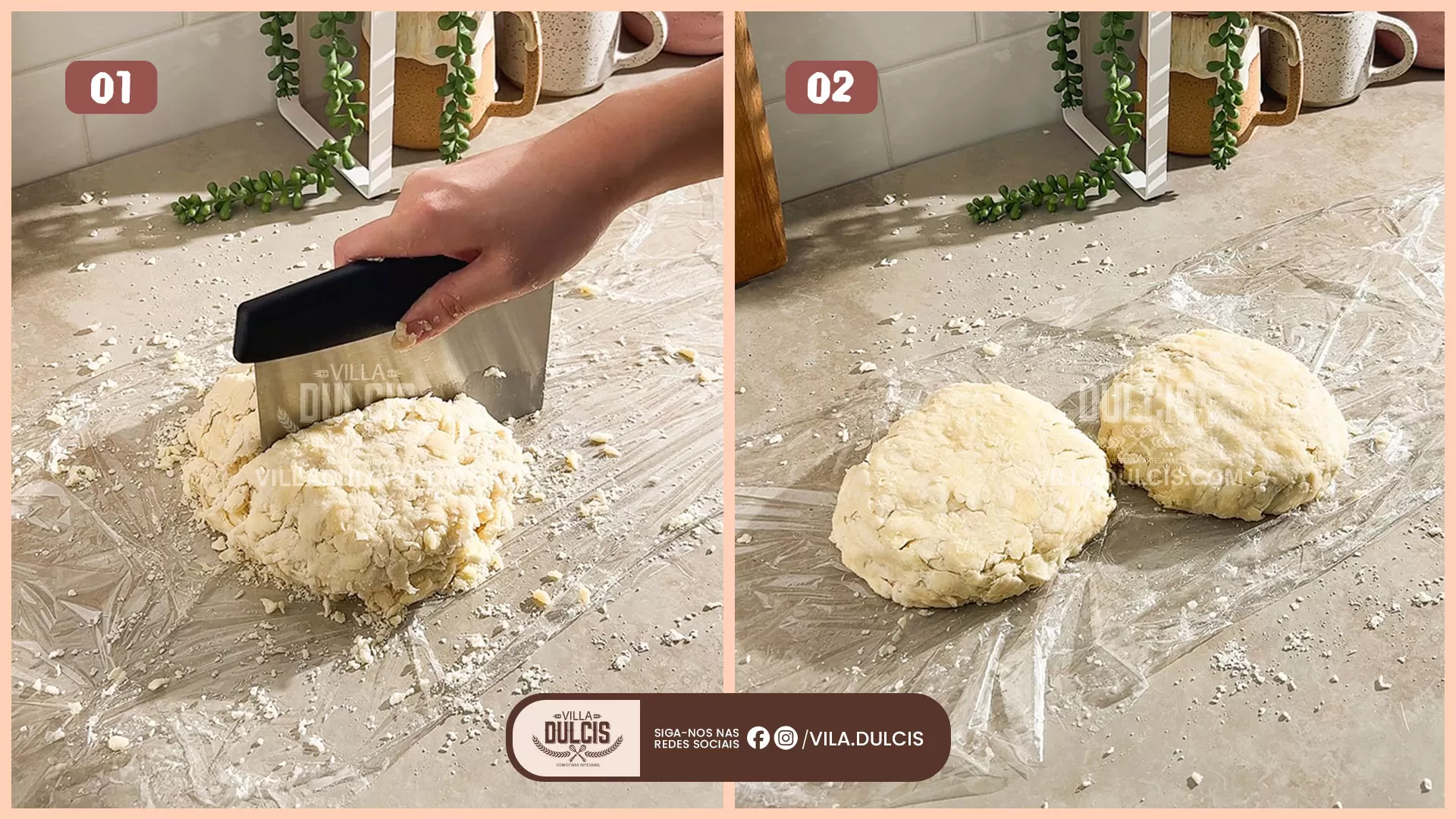 Dobre a massa – Despeje a massa em uma folha de filme plástico. Pressione a massa com as mãos e dobre-a sobre si mesma 2 a 3 vezes para fazer camadas de manteiga, mas não amasse a massa.