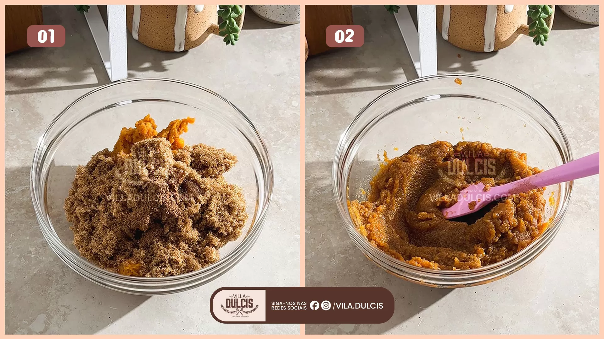 Misture o recheio – Em uma tigela média, misture o purê de abóbora, o açúcar mascavo e o tempero da torta de abóbora.